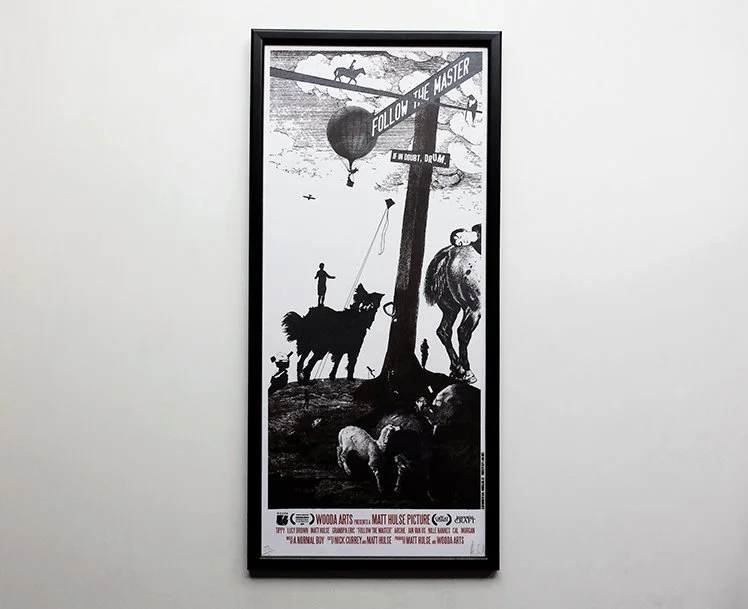 Another film FOLLOW THE MASTER – a feature film and Dadaist exploration of landscape… with a dog. Alice created an illustrated silkscreen printed poster design and a letterpress printed DVD packaging with map insert, postcards, and elements for the film's website